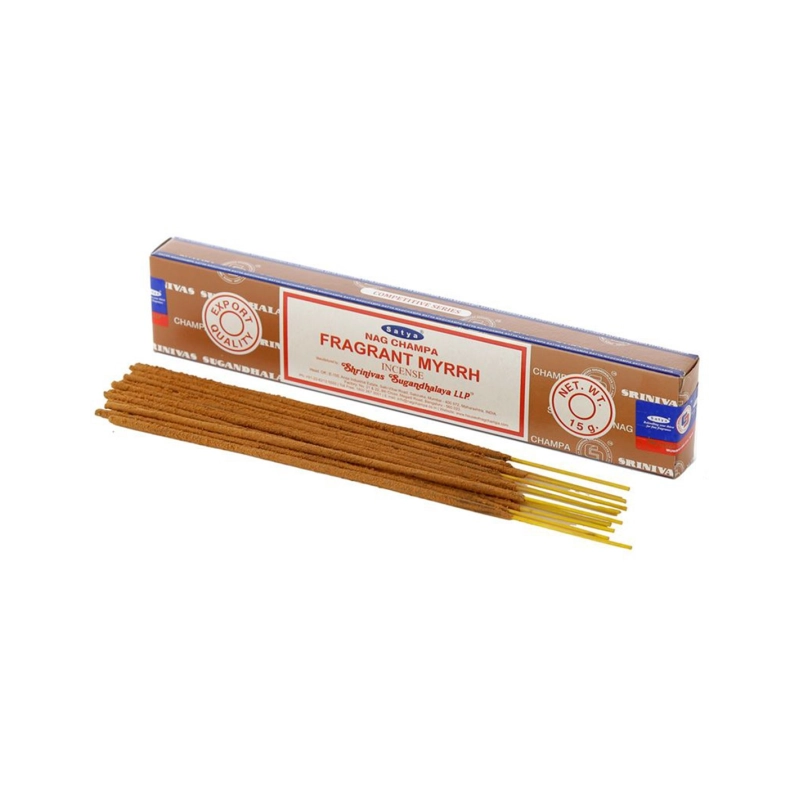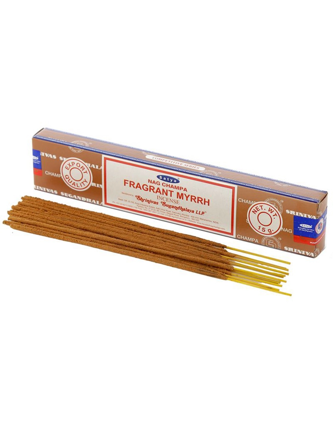 Encens fragant myrrh Satya, Boite de 15g, un encens indien au parfum de myrrhe et de résines. Issu de la grande famille des encens indiens Satya Sai baba, l'encens fragant myrrh au parfum aromatique favorise la concentration.