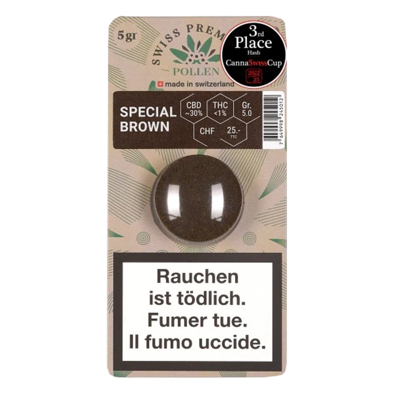 Notre Spécial Brown, gagnant la 3eme place du meilleur Hash à la CannSwiss Cup et comme son nom l’indique assez spécial. C’est d’ailleurs avec lui que nous nous sommes faits connaître dans la communauté des amateurs de résines. Ce pollen, c’est un peu notre signature. Sa couleur foncée rappelle des bons souvenirs, son aspect résineux, mais friable le rend facile d’utilisation. Il est loin de ressembler aux pollens classiques. Un pollen qui a définitivement sa place dans notre panthéon. Sa force et son apparence ne l’empêchent pas d’être assez malléable et agréable à consommer même quotidiennement. Il s’effrite rapidement et sans effort sous les doigts, libérant sa dominante florale dès les premiers instants.