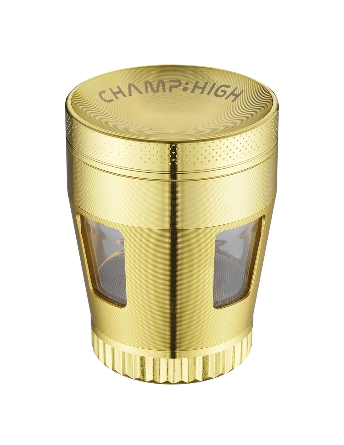 Grinder en métal de la marque Champ High de couleur or avec une fenêtre pour voir le niveau d'herbe et le couvercle peut être utilisé comme mini cendrier ou bol à mix. Ce grinder de 50mm à une forme particulière et se distingue des autres modèles. Grâce à ses 4 parties dont une avec un tamis pour filtrer le pollen de vos herbes préférées .