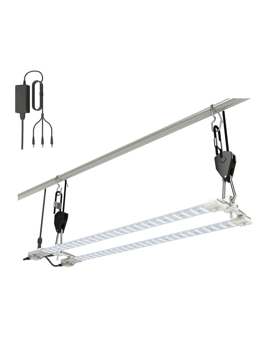 Le TNoled 2x20W Kit contient 2 barres LED 20W, un ballast avec câble d’alimentation, 2 poulies et 2 barres de support.