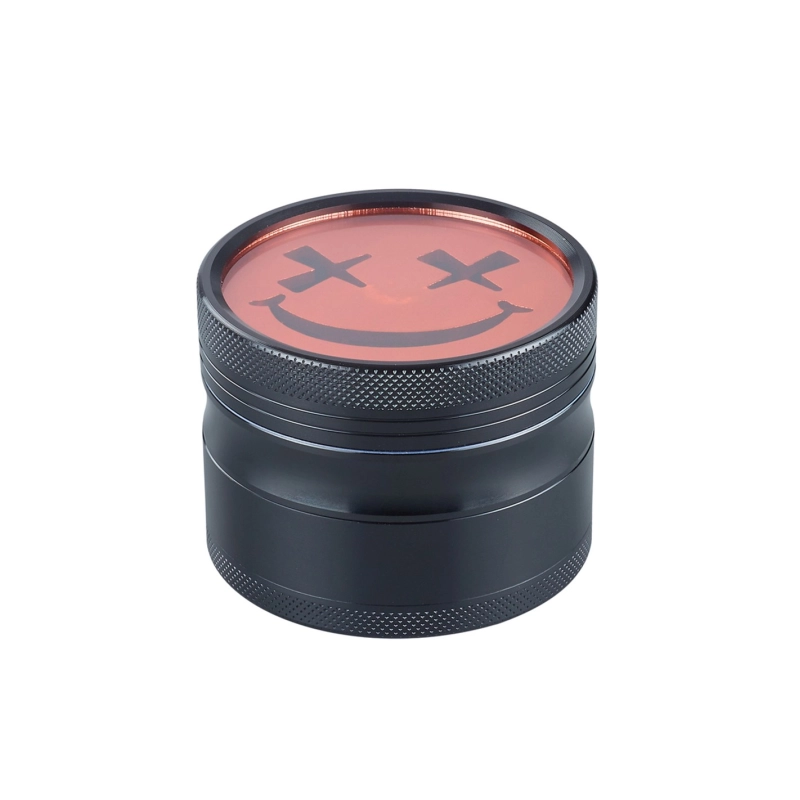 Grinder en métal composé de 4 parties faisant 63mm de diamètre dont une partie avec un tamis qui pourra récolter le pollen de vos herbes préférées. Ce grinder à un couvercle transparent avec un smiley rouge avec les yeux en croix sous le couvercle