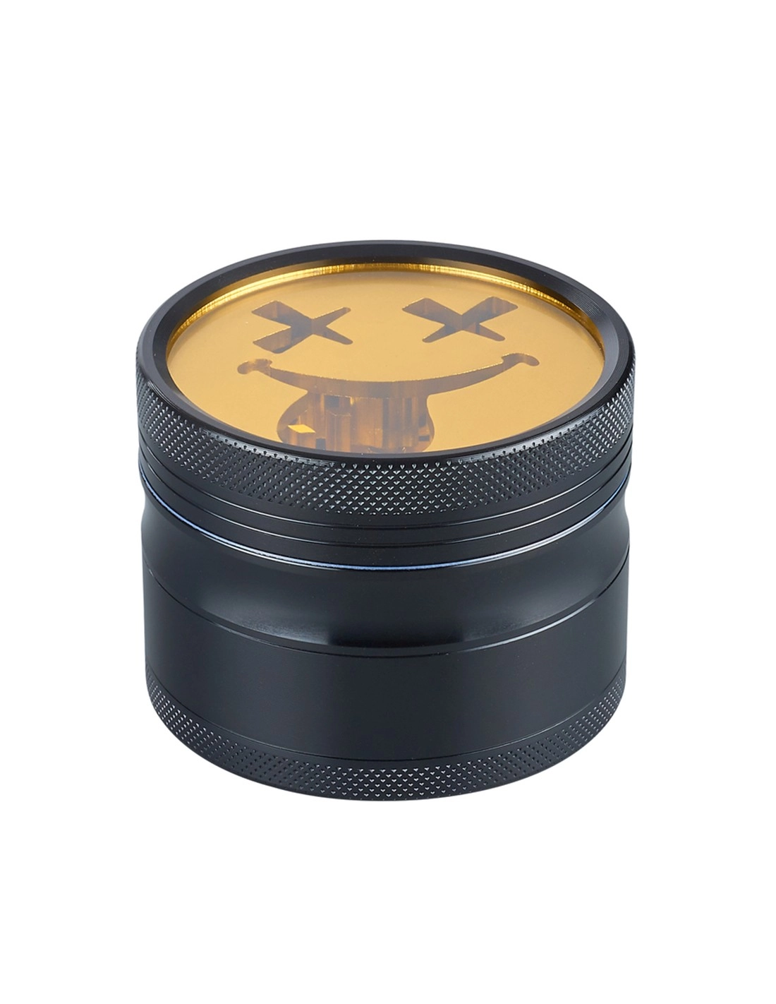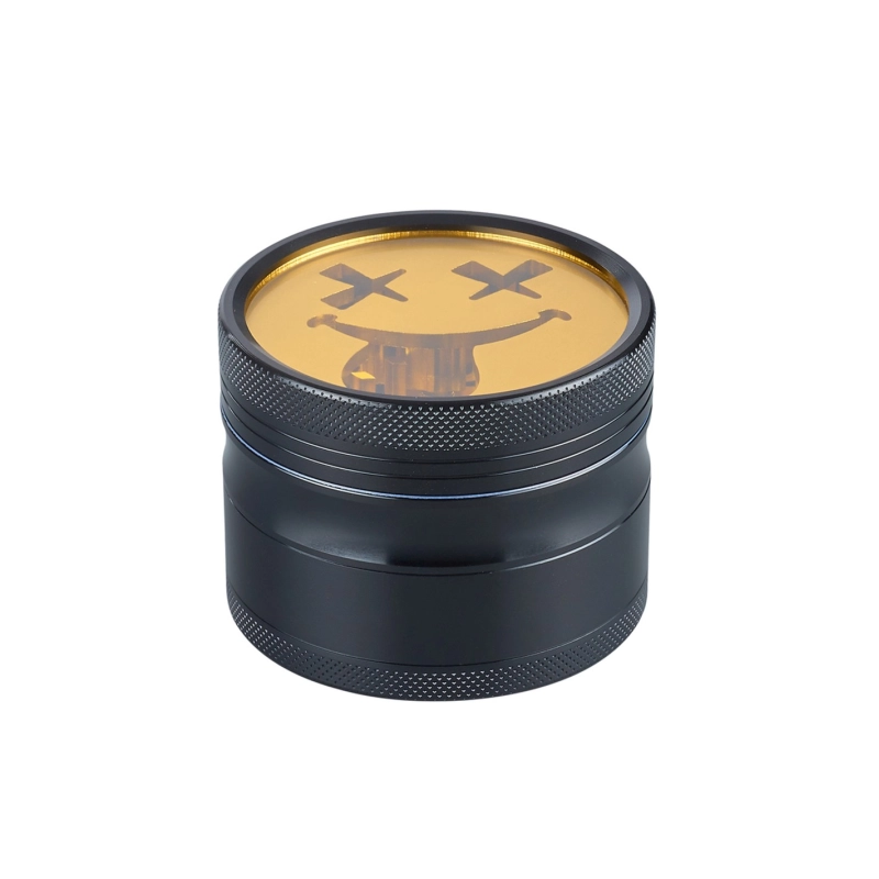 Grinder en métal composé de 4 parties faisant 63mm de diamètre dont une partie avec un tamis qui pourra récolter le pollen de vos herbes préférées. Ce grinder à un couvercle transparent avec un smiley dorée avec les yeux en croix sous le couvercle