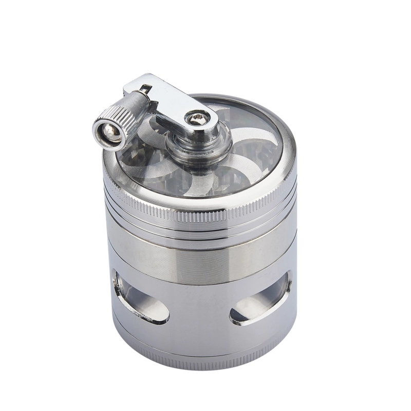 Grinder en métal de la marque Champ High en 4 parties avec un tamis. Le grinder est muni d'une fenêtre transparente au travers de laquelle vous pourrez voir vos herbes êtres effritée et contrairement à d'autres grinder, il faut tourner une manivelle pour effriter vos weeds.
