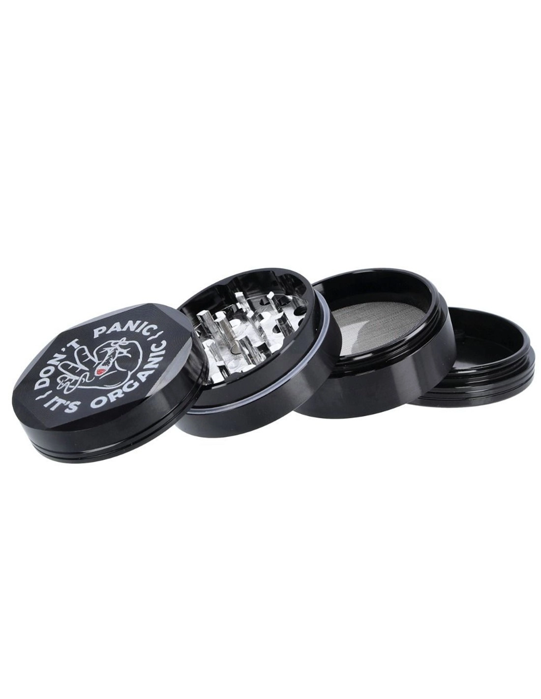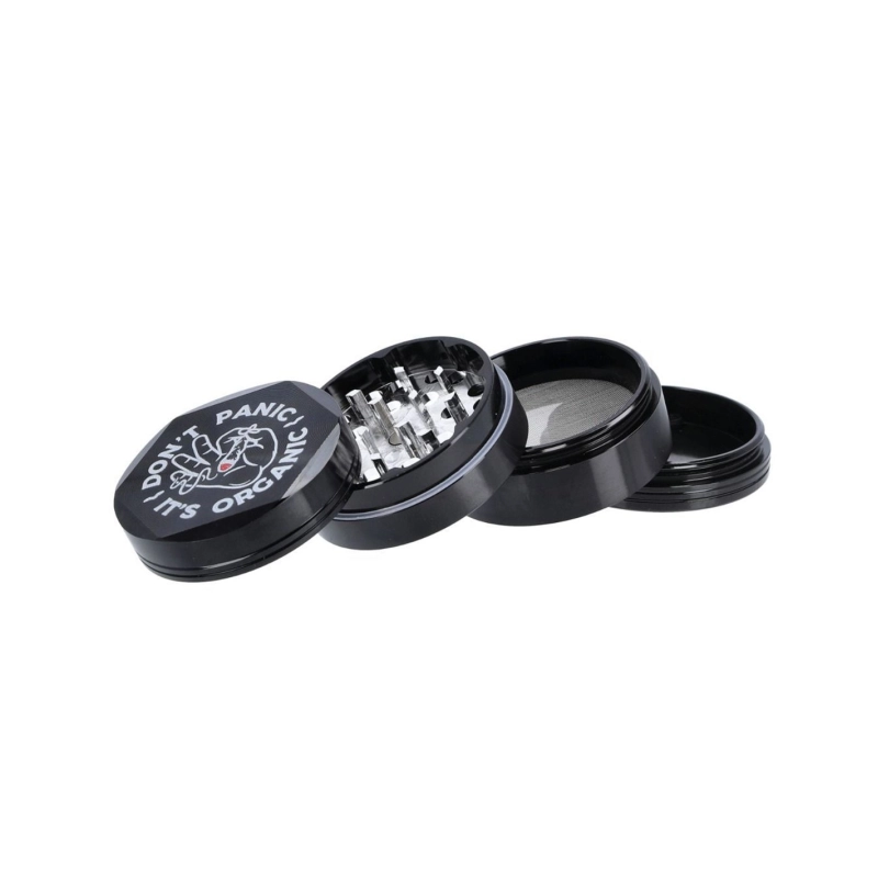 Grinder de couleur noir en métal comprenant 4 parties dont une avec un tamis qui vous permets de récolter le pollen de vos herbes préférées. Sur le couvercle du grinder, il y a une main qui tient un joint avec l'inscription Don't Panic