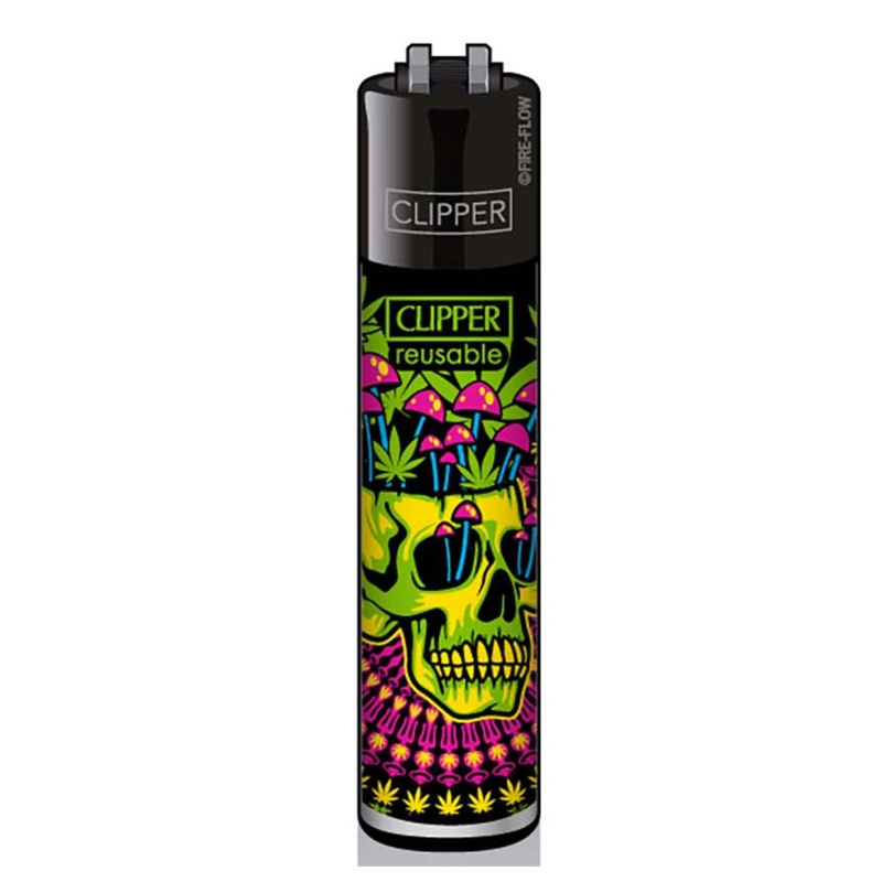 Clipper Trippy Skull avec une tête de mort remplie de champignons et de feuilles de cannabis et comme tous les Clipper, vous pourrez changer la pierre à feu et recharger avec du gaz prévu à cet effet.