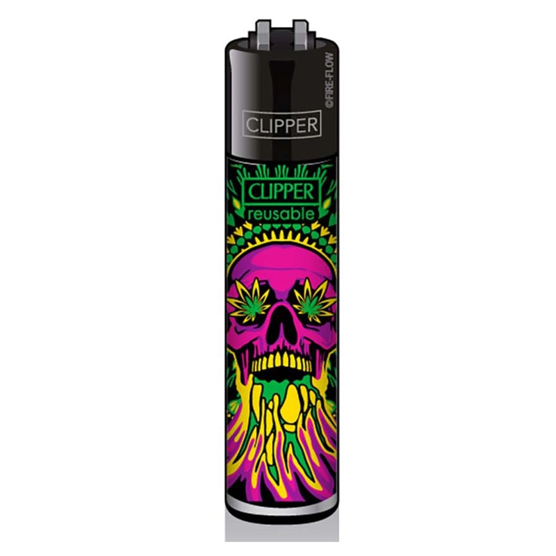 Clipper Trippy Skull avec une tête de mort qui a des feuilles de cannabis sortant de ses yeux et comme tous les Clipper, vous pourrez changer la pierre à feu et recharger avec du gaz prévu à cet effet.