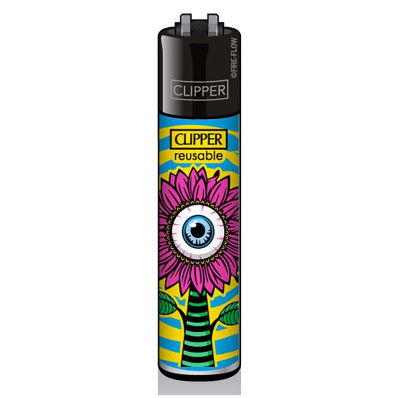 Briquet Clipper de couleur avec une fleur avec un œil et des pétales roses et comme tous les Clipper, vous pouvez changer la pierre et recharger avec du gaz prévu à cet effet