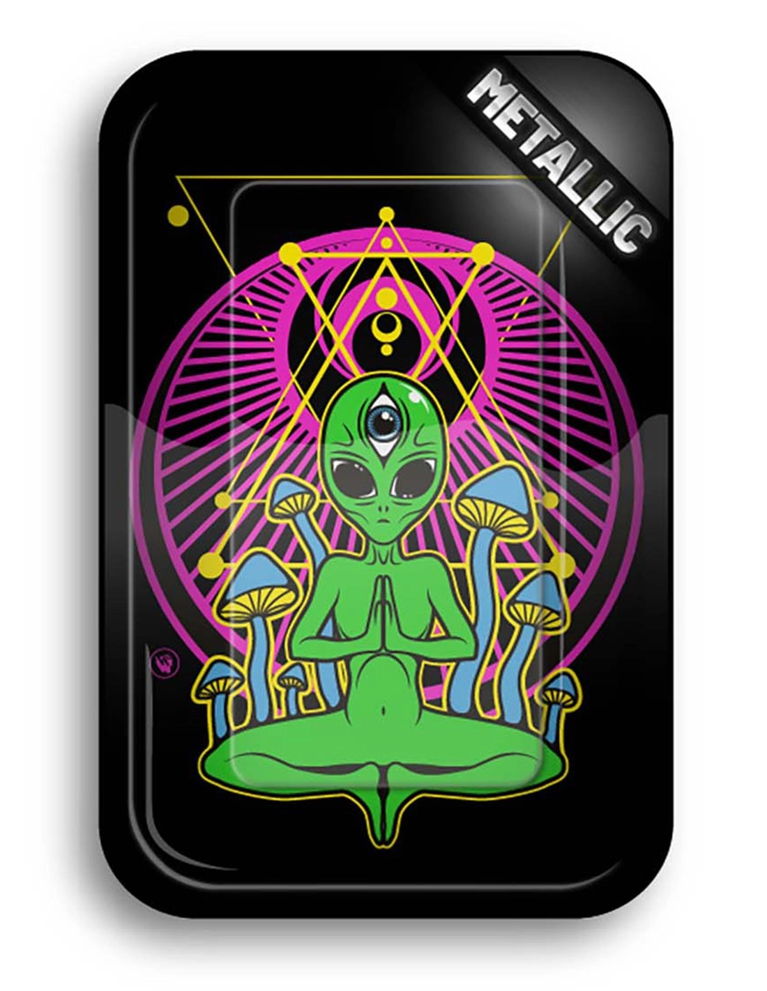 Plateau à mix en métal de 27.5 x 17.5cm de la marque Fire Flow représentant un alien qui médite avec un 3ème œil, les plateau sont très pratique lorsque vous voulez rouler et éviter d'en mettre partout