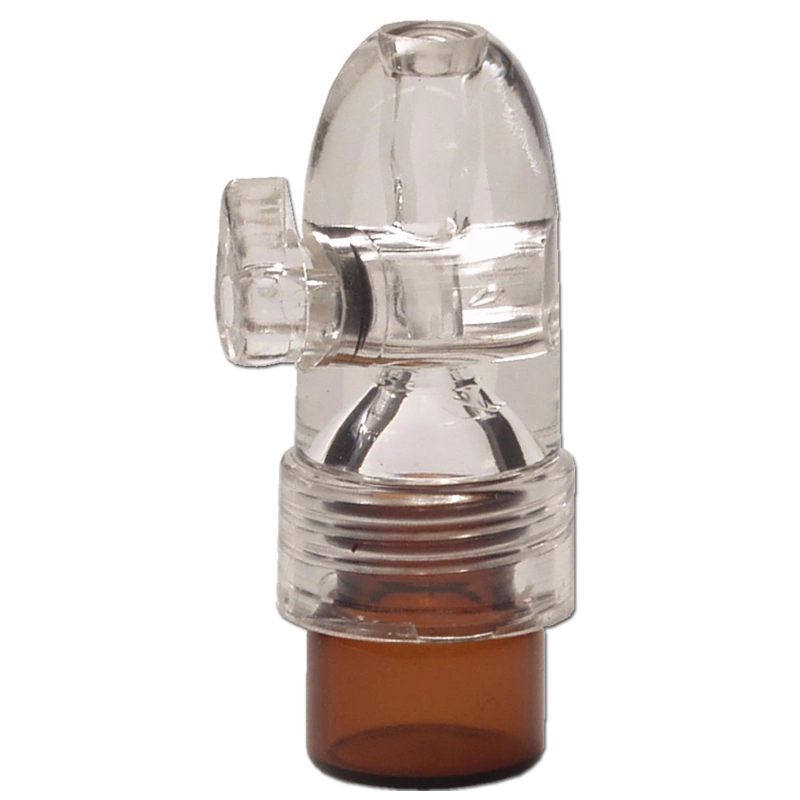 Petit doseur de 47mm de long en plastique de couleur brun et blanc permettant de stocker 1.8ml de tabac à priser, il suffit d'ouvrir la vanne sur le côté et aspirer