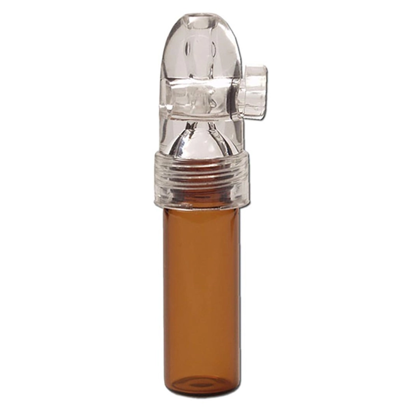 Petit doseur de 73mm de long en plastique de couleur brun et blanc permettant de stocker 6.2ml de tabac à priser, il suffit d'ouvrir la vanne sur le côté et aspirer