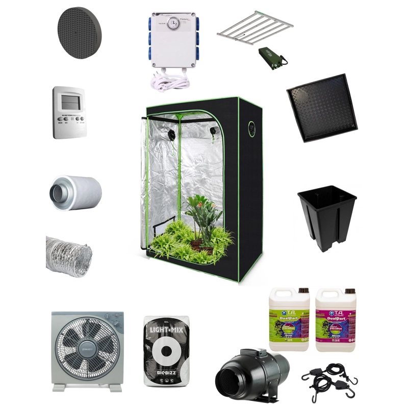 Kit avec un box de culture Black Room d'une dimensions de 60 x 120cm avec tout le matériel nécessaire pour faire pousser vos plantes à l'intérieur