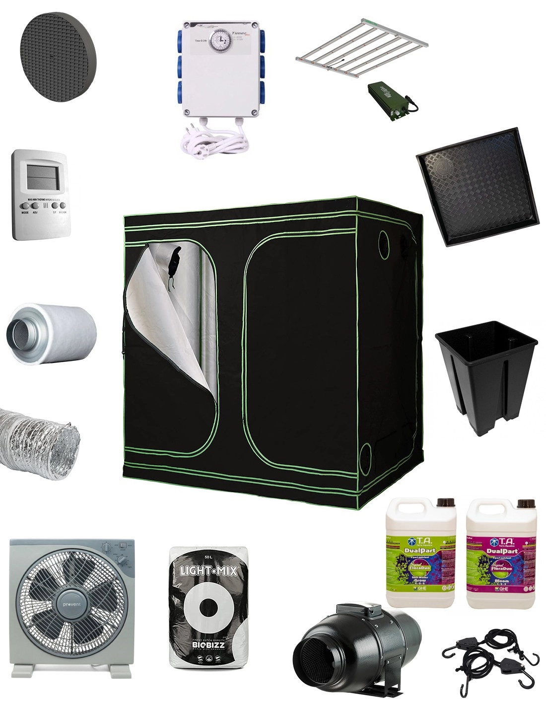 Kit avec un box de culture Black Room d'une dimensions de 150 x 300cm avec tout le matériel nécessaire pour faire pousser vos plantes à l'intérieur