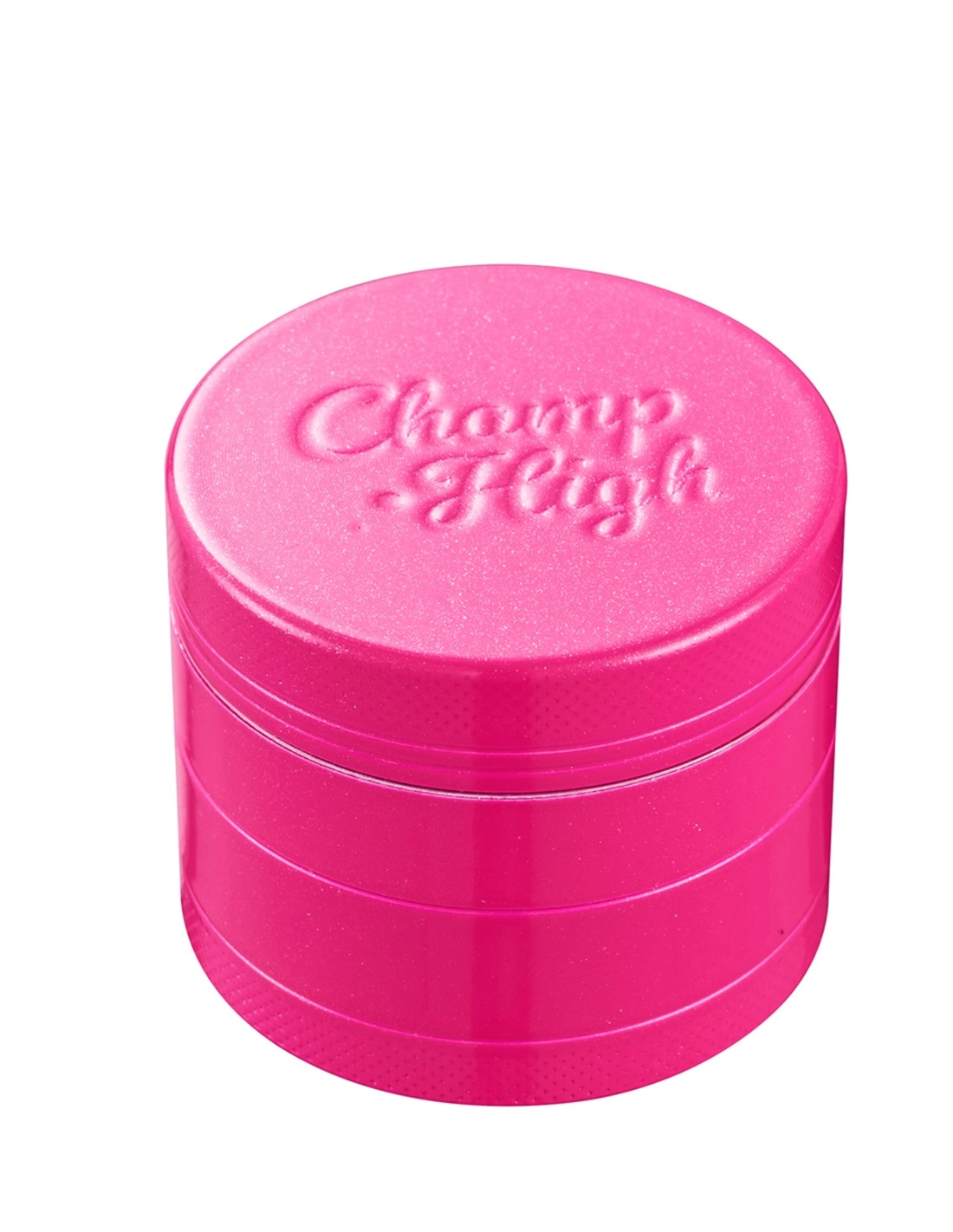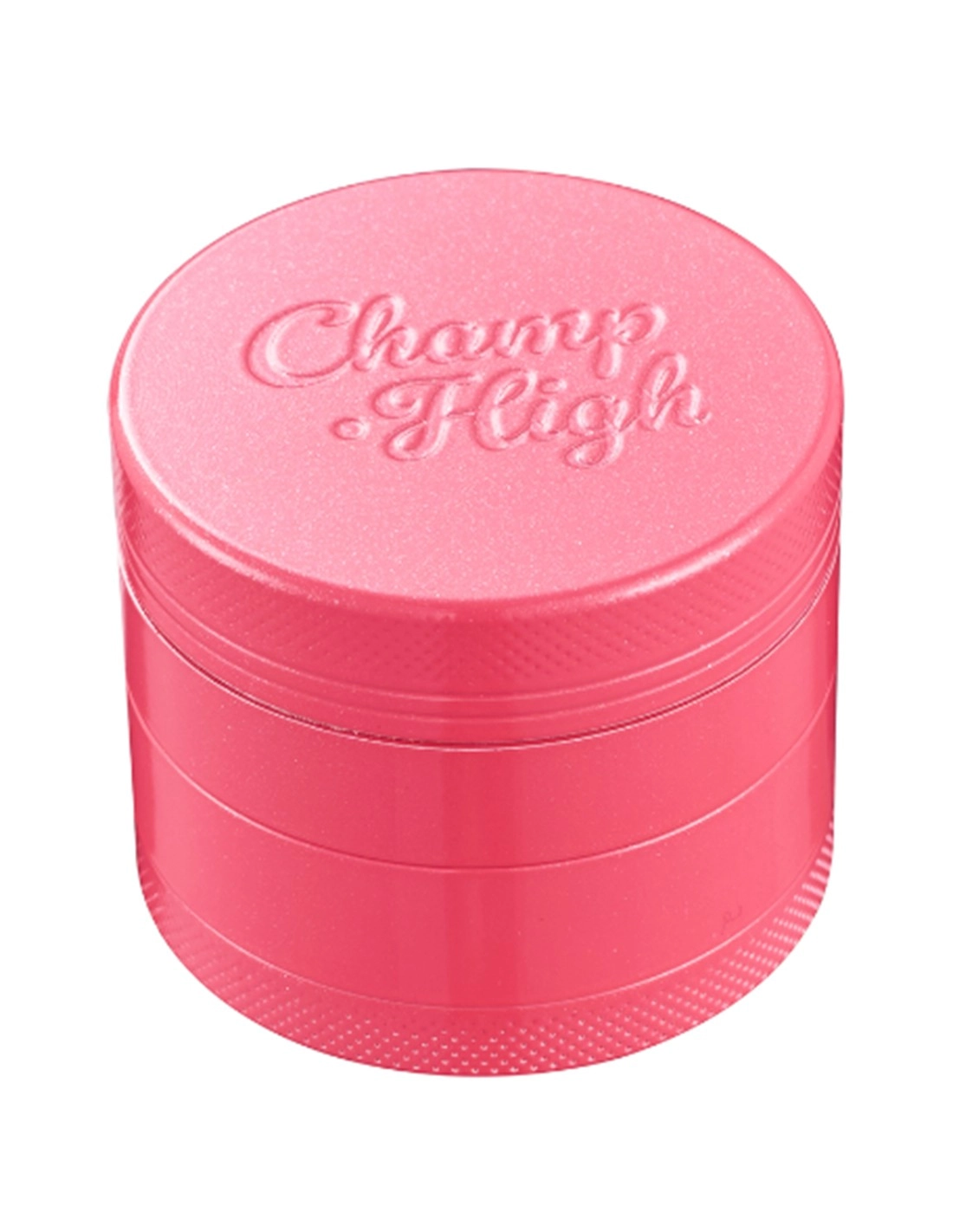 Grinder 4 Parties Champ High de couleurs roses en aluminium ayant un diamètre et une hauteur de 50mm. Ces grinders sont équipés de dents en forme de diamant qui permet une coupe fine et parfaite de vos herbes.