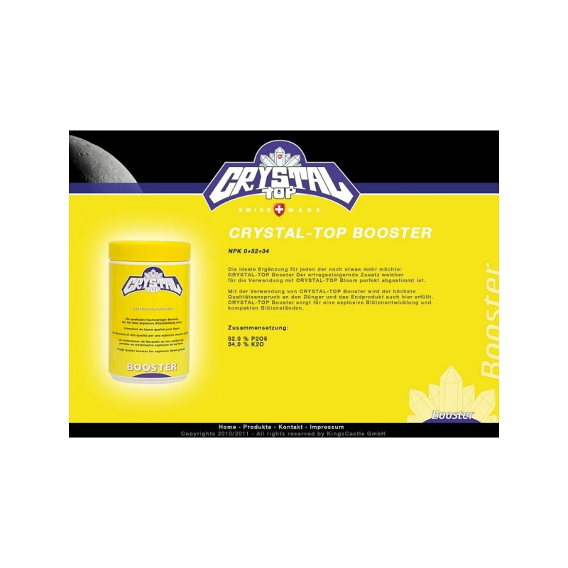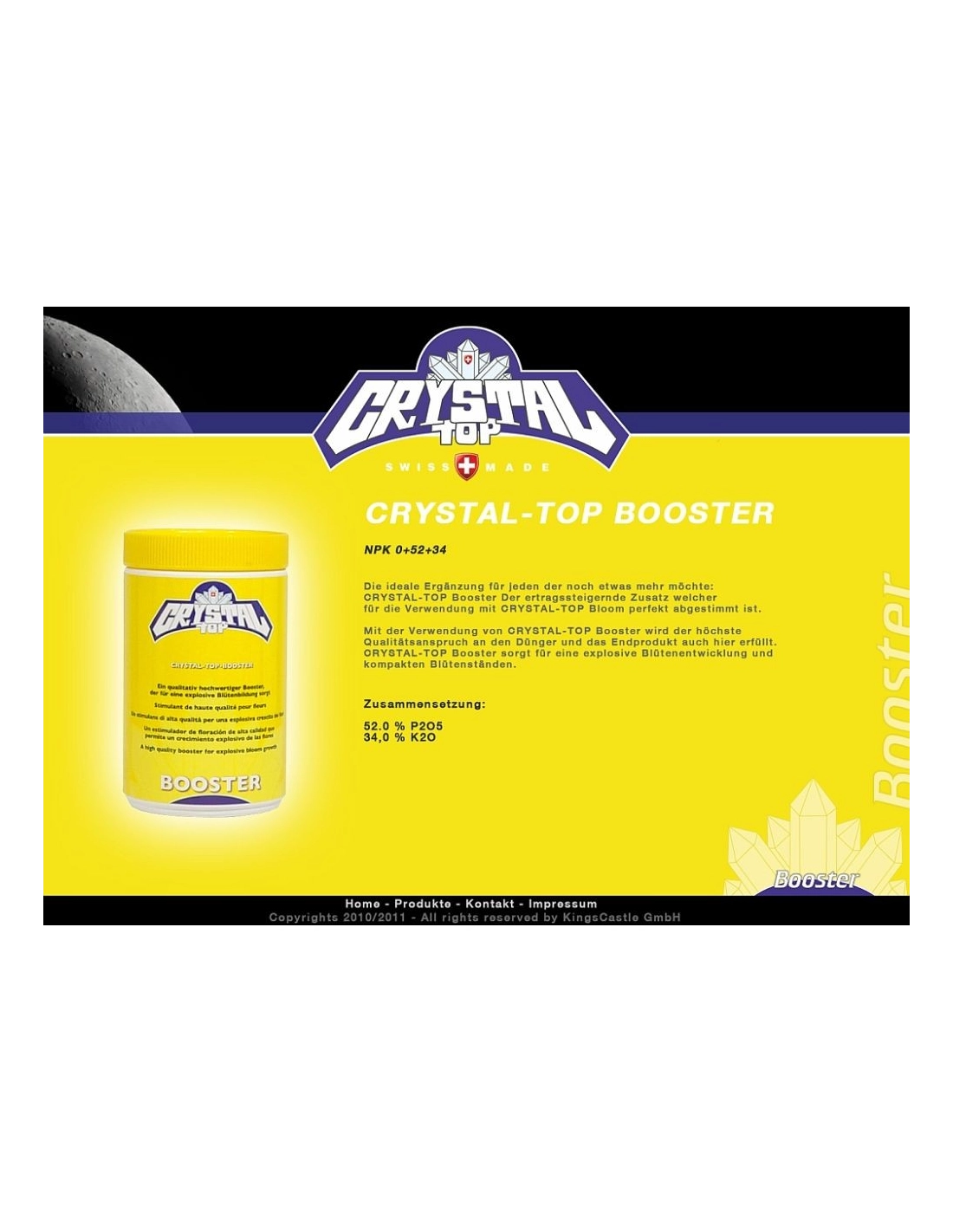 Un petit plus pour un grand impact! Le complément idéal pour tous ceux qui en veulent un peu plus: Pour un rendement optimum Crystal Top Booster est parfaitement adapté pour une utilisation avec Crystal Top Bloom. Crystal Top Booster saura satisfaire les cultivateurs les plus exigeants. Développement et floraison explosive.
