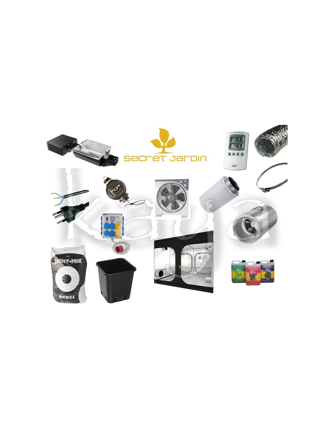 1 Dark Room 300 4.0 (300x300x217cm) 4 Lumen King 1000W DE 400V Dimmable 6 Easy rollers 1 GSE Timer Box 12x600W 380V 2 Ventilateur BoxFan 30cm Typhoon 1 Thermo Hygromètre 2 Iso-Max CAN Fan 1480m3/h 250mm 4 Tube aluconnect 250mm 1m 8 Bride de serrage 127 - 315mm 2 Rhino Pro Filter 250mm 1420m3/h 100 Pots carrés 11L 4 Flexi Tray 150 24 Light mix 50lt 1 Flora Duo Grow 5L 1 Flora Duo Bloom 5L - Pour d'autres options (hydroponie, aéroponie, culture sur substrat de coco, autre reflecteur, etc.), veuillez nous contacter nous vous ferons une offre personalisée.