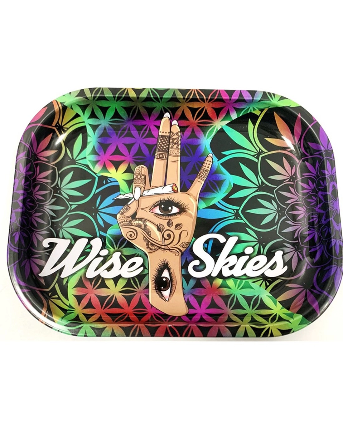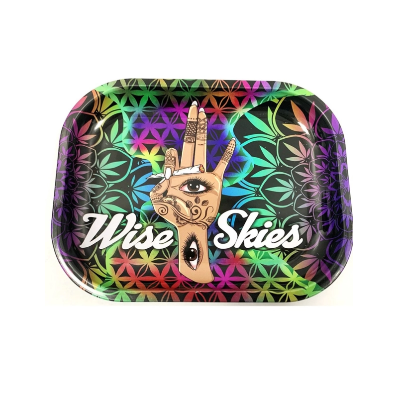 Plateau à mix de marque Wise Skies en métal d'une dimensions de 14 x 18cm avec une image multicolore qui regroupe des feuilles de cannabis de couleurs et une main avec un œil qui tient un joint.