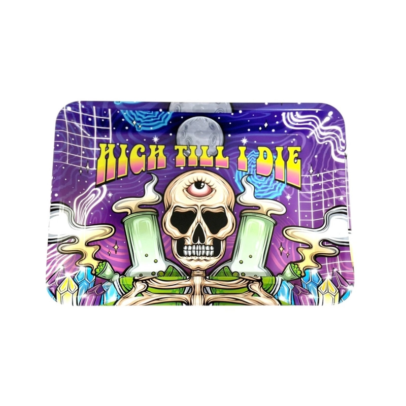 Plateau à mix de marque Wise Skies en métal d’une dimension de 14 x 18cm avec une image d'un squelette avec un bong fumant de chaque côté