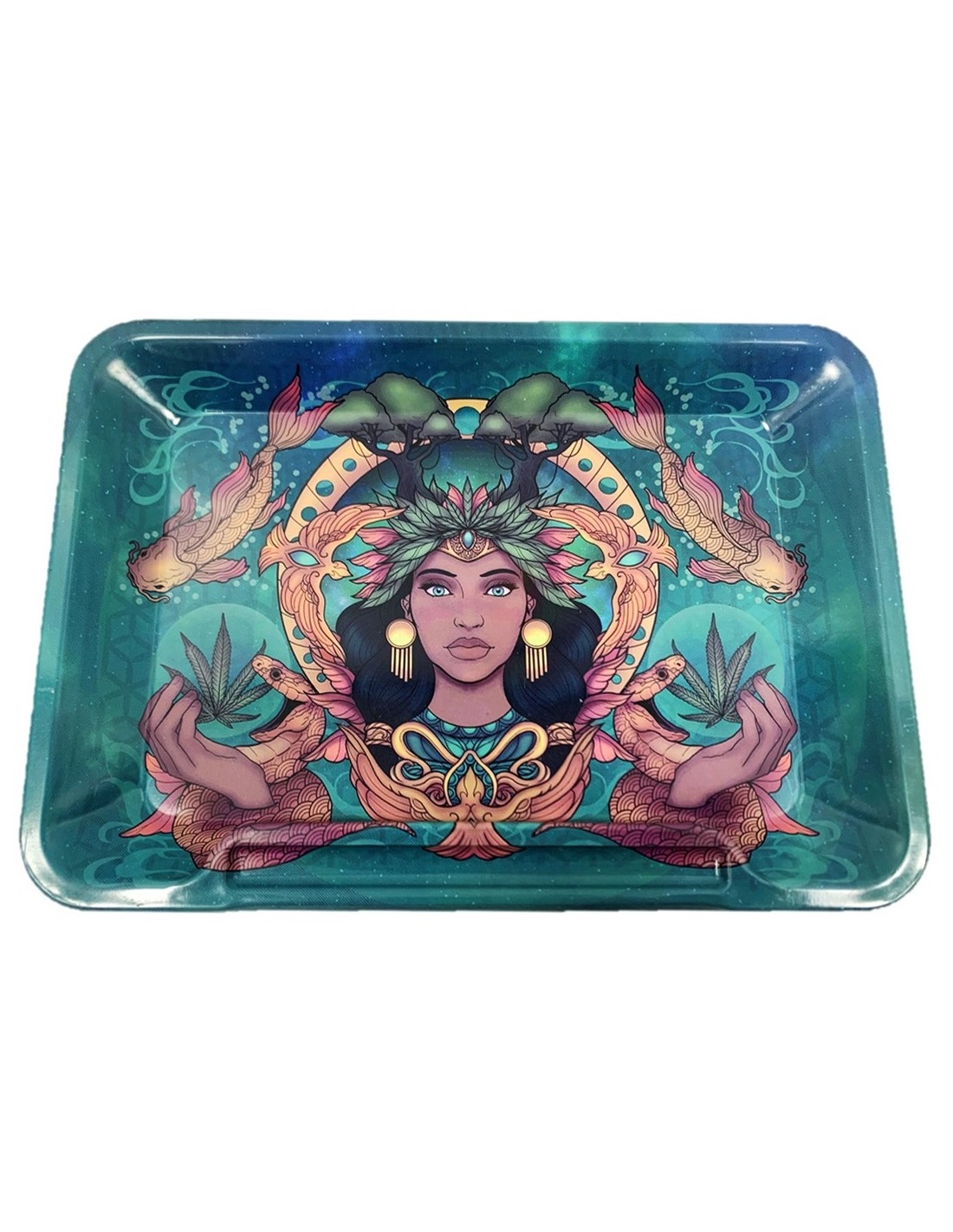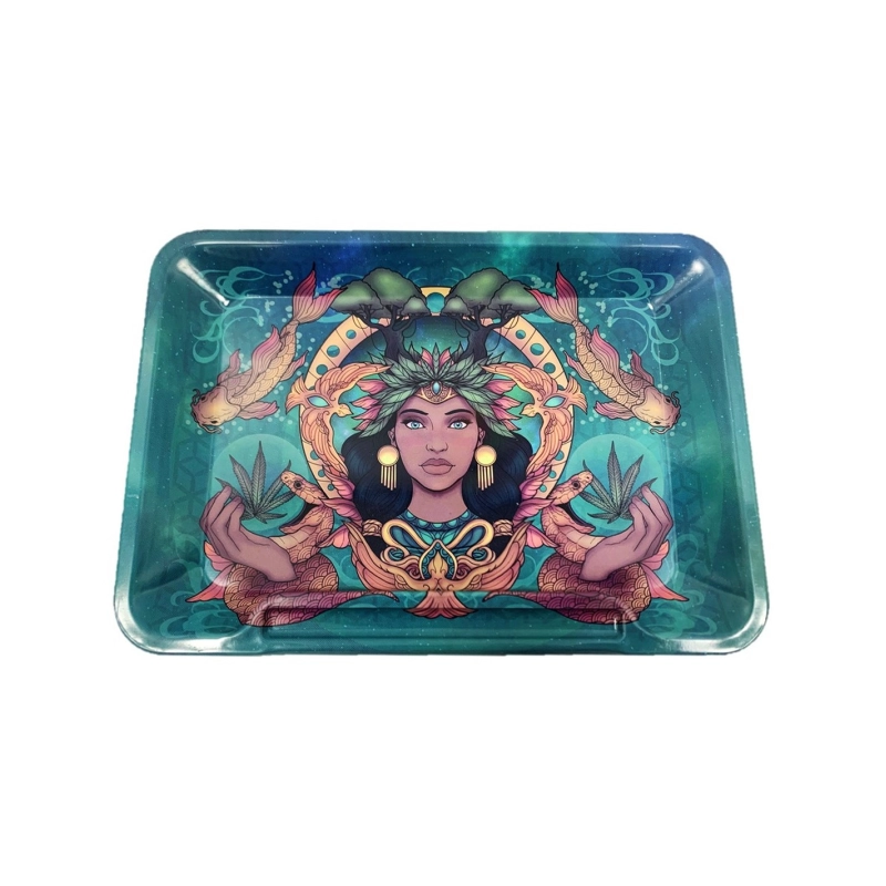 Plateau à mix de marque Wise Skies en métal d’une dimension de 14 x 18cm avec une image de mère nature entourée d'animaux et de feuilles de chanvre. Ce plateau est idéal pour éviter de mettre de la mix partout pendant que vous roulez