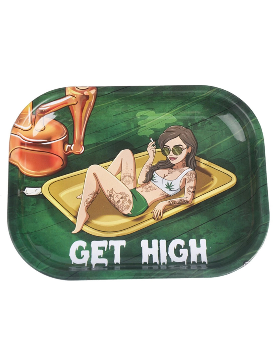Plateau à mix de marque Wise Skies en métal d’une dimension de 14 x 18cm avec une image d'une femme couchée sur un plateau à mix en fumant un joint avec l'inscription Get High.