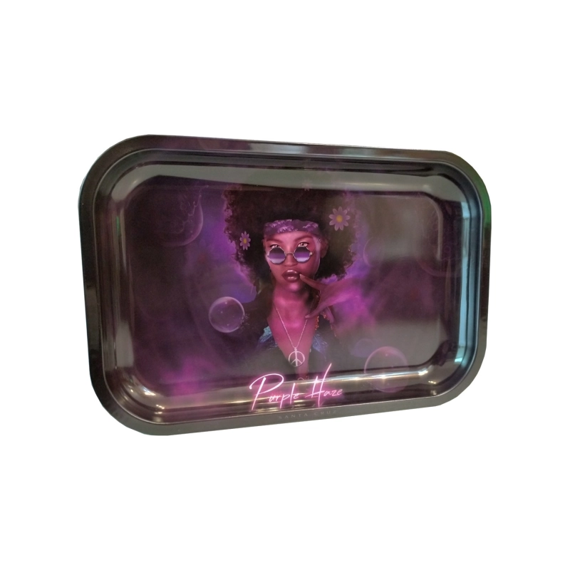 Plateau à mix en métal violet d'une dimension de 29 x 19cm avec miss Purple Haze arborant un look hippie. Ce plateau est très pratique pour éviter de mettre de la mix partout lorsque vous roulez vos joints.