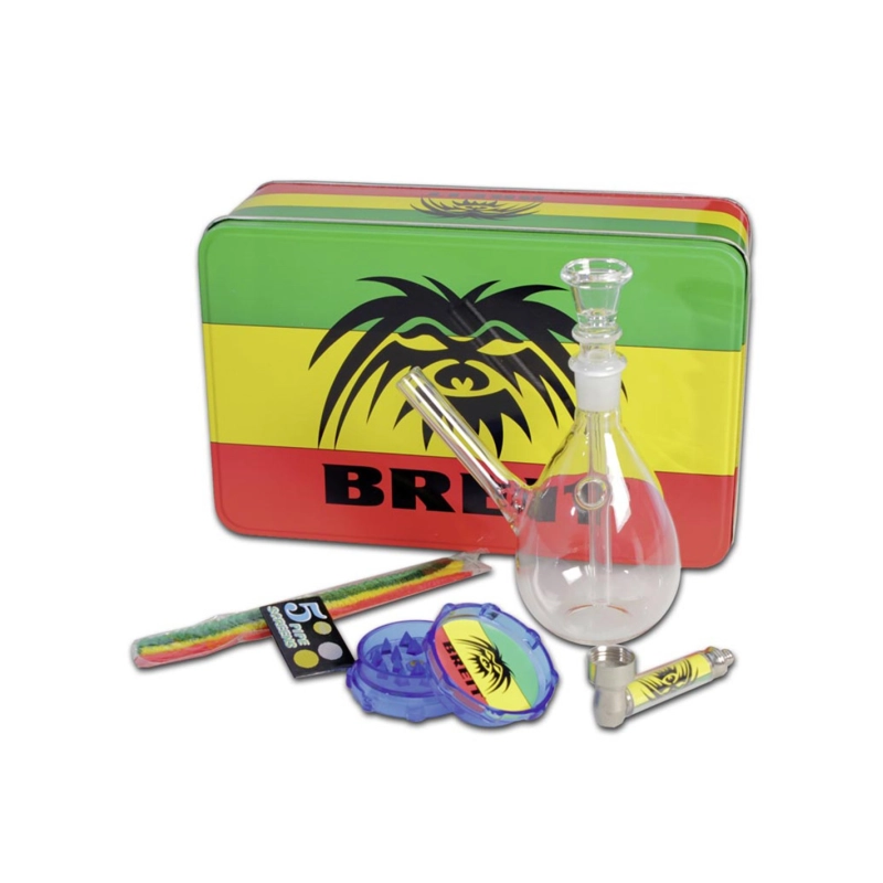 Coffret en métal de la marque Breit contenant tous les accessoires pour les fumeurs de CBD. Dans ce coffret vous retrouverez un bong, une pipe, grinder, grilles ainsi que des cures pipes pour le nettoyage.