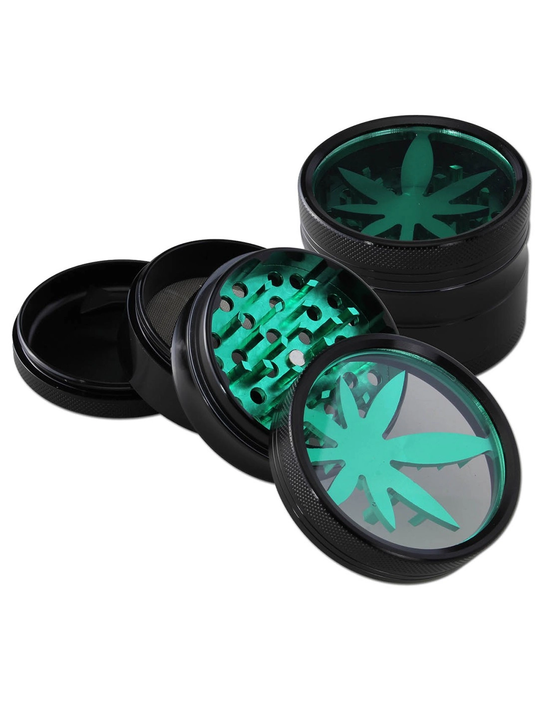 Grinder en métal de la marque Black Leaf ayant 4 parties dont une servant à récolter le pollen de vos herbes préférées. Ce grinder de 62mm de diamètre à l'avantage d'avoir une fenêtre et ainsi, vous pourrez voir si votre herbe est assez hachée sans devoir ouvrir votre grinder de plus, la votre est décoré d'une feuille de cannabis de couleur verte métallisée.