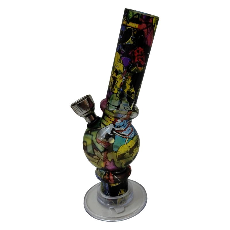 Mini bong acrylique d'une hauteur de 15cm avec des couleurs vive et des motifs décalés. Du fait de sa taille, vous pourrez l'emporter partout avec vous que ça soit dans un sac ou même une poche.