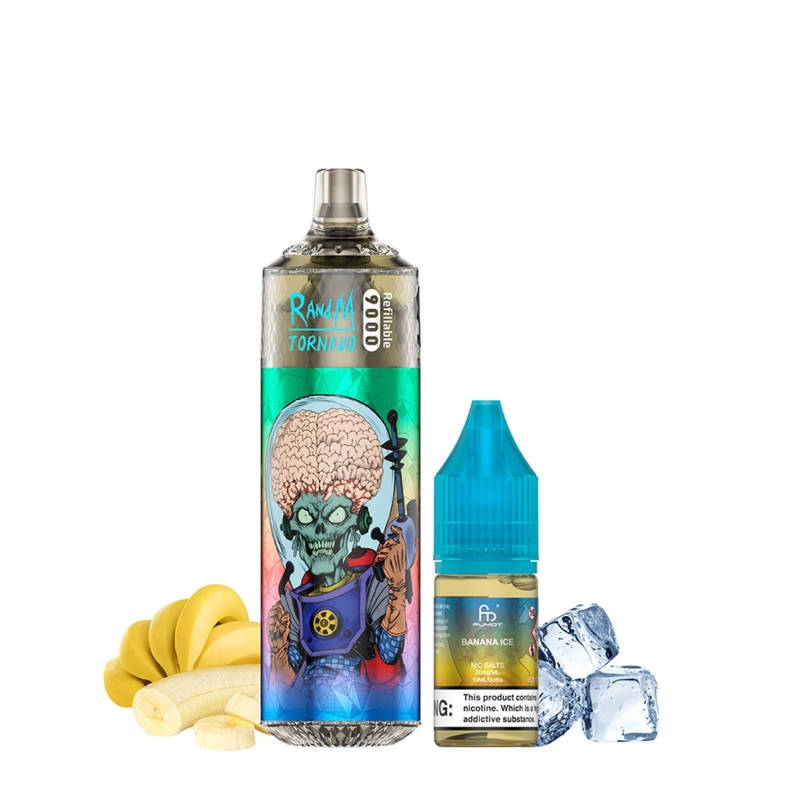 Ces nouvelles Tornado 9000 sont livrées avec un réservoir de 10ml et une bouteille de liquide Fumot RandM Tornado de 10ml à 2% de sel de nicotine, mais vous pouvez acheter séparément une deuxième bouteille de 10ml afin de remplir complétement votre puff une fois qu'elle sera vide et ainsi profiter d’environs 9000 tirées.