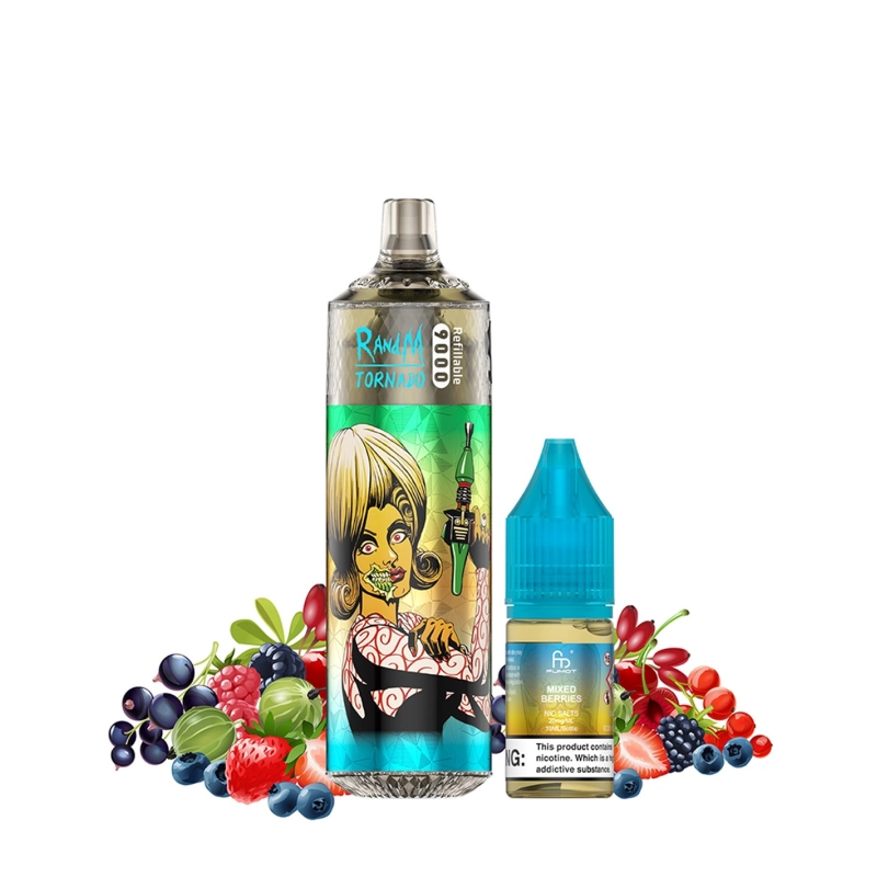 Ces nouvelles Tornado 9000 sont livrées avec un réservoir de 10ml et une bouteille de liquide Fumot RandM Tornado de 10ml à 2% de sel de nicotine, mais vous pouvez acheter séparément une deuxième bouteille de 10ml afin de remplir à nouveau complétement votre puff une fois qu'elle sera vide et ainsi profiter d’environs 9000 tirées.