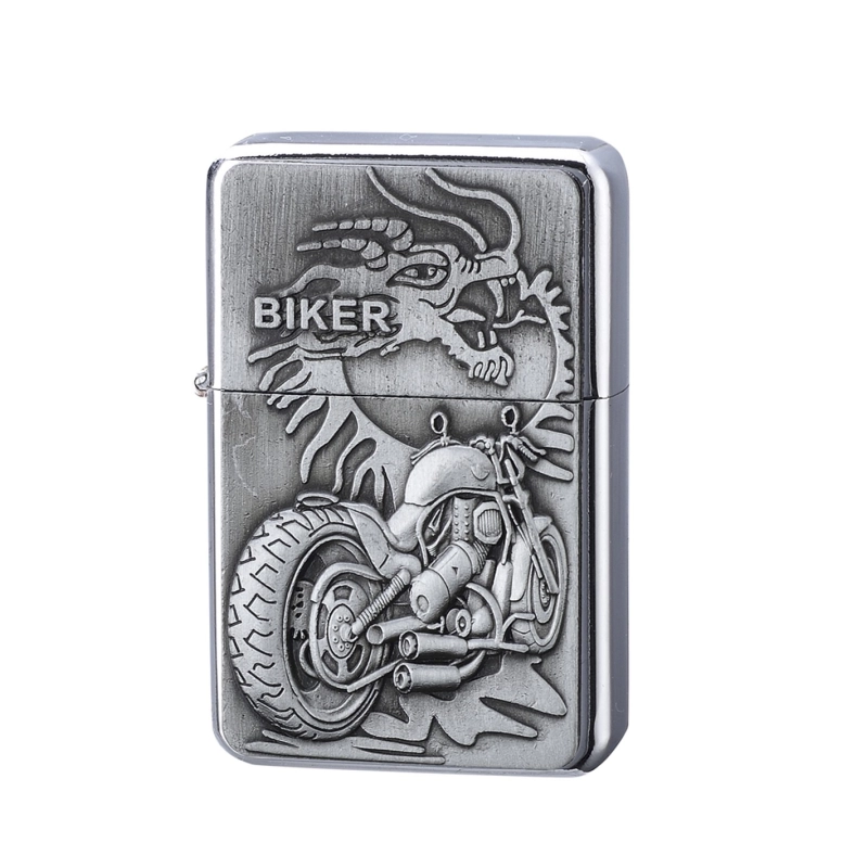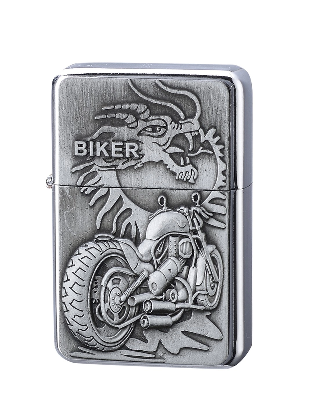 Briquet à essence de type Zippo en métal de gris avec une moto et un aigle de couleur gris avec l'inscription Biker. Pour l'utilisez, il vous faut de l'essence à zippo