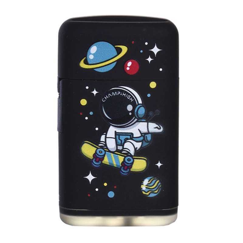 Briquet tempête de couleur noir avec un petit astronaute qui fait du skate. Grâce à sa flamme bleue, vous pourrez utiliser votre briquet même par fort vent
