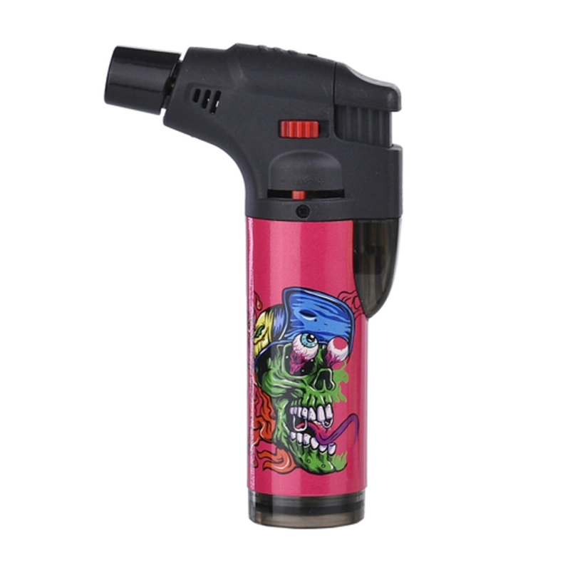 Briquet EasyTorch à gaz de couleur rose avec un crâne fou. Grâce à ce briquet, vous pourrez allumer votre cigarette même par fort vent. Ce briquet dispose d'un mécanisme qui vous permets aussi de régler la flamme de votre briquet