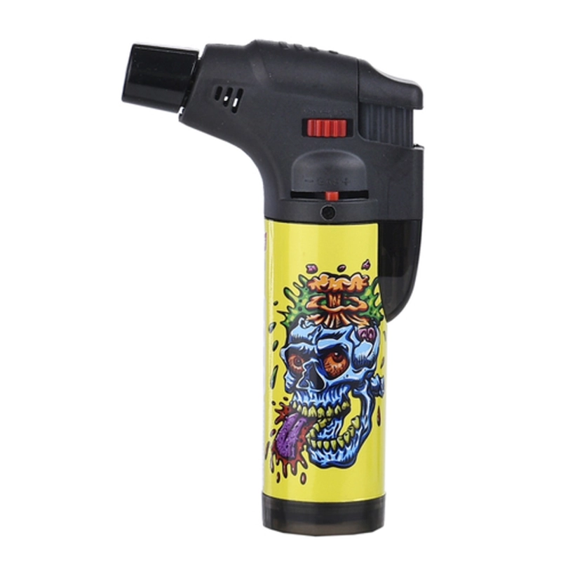 Briquet EasyTorch à gaz de couleur jaune avec un crâne fou. Grâce à ce briquet, vous pourrez allumer votre cigarette même par fort vent. Ce briquet dispose d'un mécanisme qui vous permets aussi de régler la flamme de votre briquet