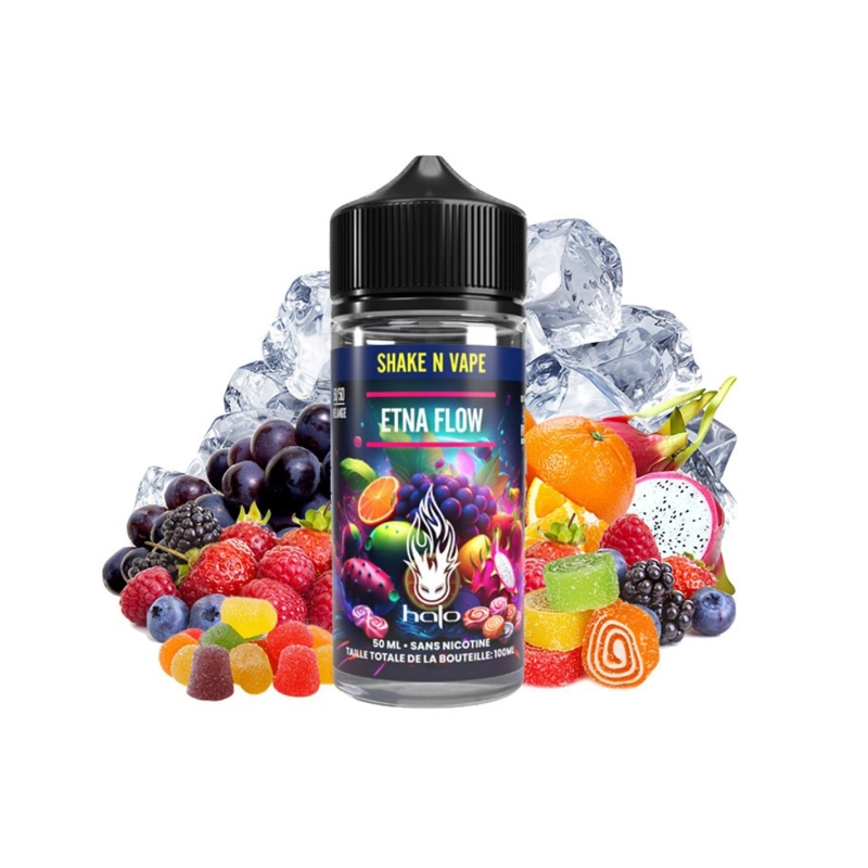 E liquide Etna Flow Halo 50 ml. Une saveur de bonbon fruitée, avec une touche de fraicheur. E liquide Halo 50 ml avec une composition en 50/50 de PG/VG et 0 mg de nicotine. Disponible en flacon de 50 ml, pouvant contenir 100 ml pour l'ajout de boosters.