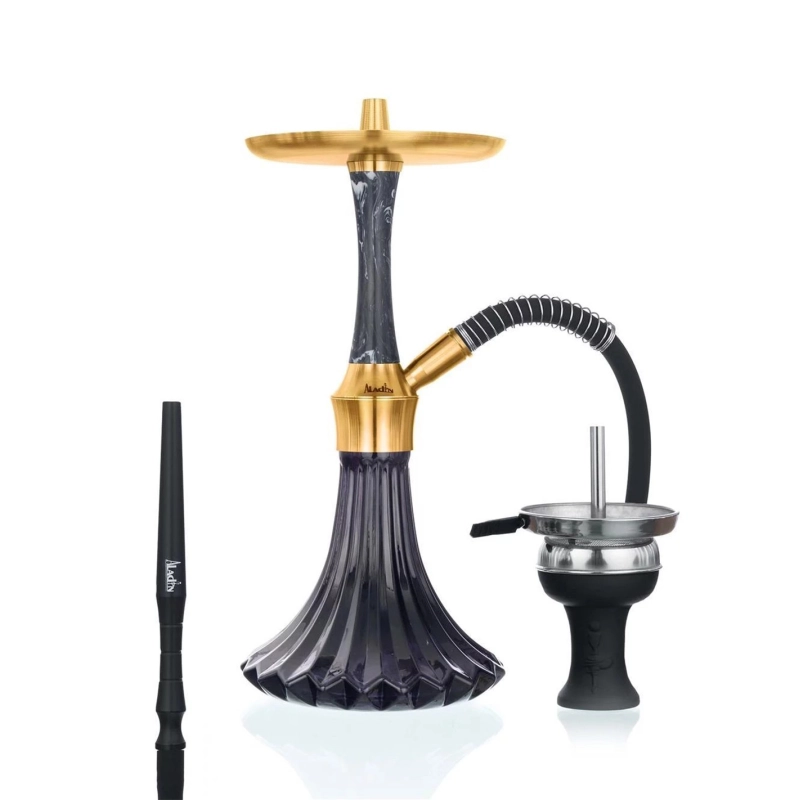 Nouvelles chicha Aladin Epox de gamme premium faisant une hauteur de 36cm sans le foyer: Les matériaux utilisés sont l'acier inox et le verre cristal de 5mm pour le vase.