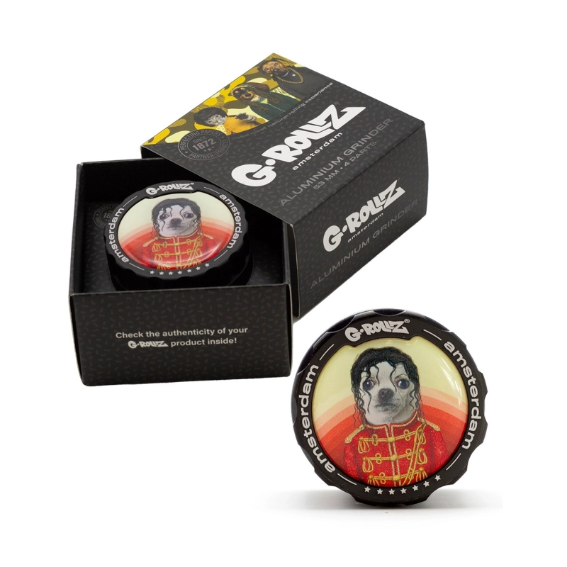Grinder en métal de la marque G Rollz qui est décoré avec une pastille représentant Michael Jackson en chien. Ce grinder à un diamètre de 53mm et contient 4 compartiments dont 1 pour récupérer le pollen de vos herbes préférées afin de pouvoir le fumer par après.