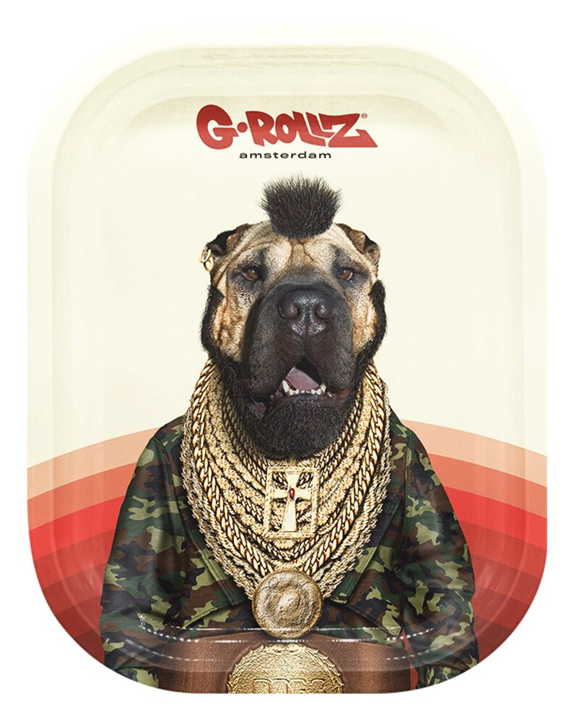 Plateau à mix en métal de la marque G Rollz d'une dimension de 14 x 18cm de couleur blanc cassé avec un chien ressemblant fortement à Mister T de l'agence tous risque