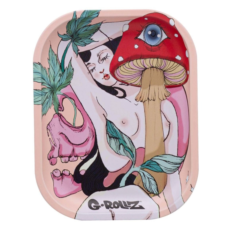 Plateau à mix en métal de la marque G Rollz d'une dimension de 14 x 18cm de couleur rose avec une femme dévêtue avec un champignon hallucinogène