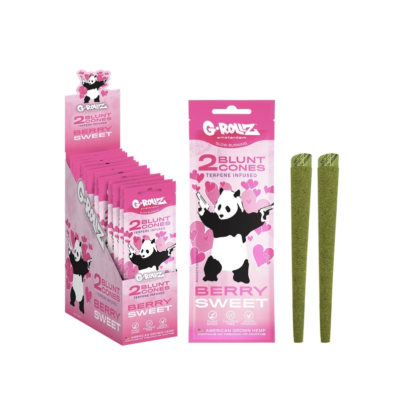 Blunt pré roulé de la marque G Rollz infusé au terpènes de Berry Sweet vendus par pack de 2 et contrairement aux blunts classiques, ceux ci ne contiennent pas de tabac car ils sont produits à partir de chanvre biologique.