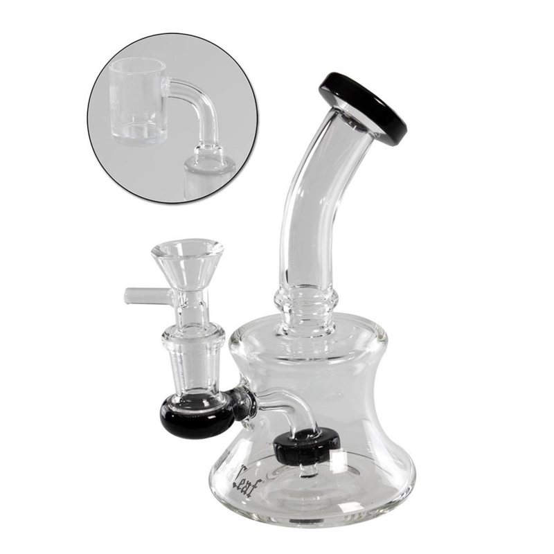 Petit bong de la marque Black Leaf avec des éléments décoratifs de couleur noir. L'intérieur du bong est muni d'un percolateur à tambour qui assure un refroidissement et un filtrage parfait.