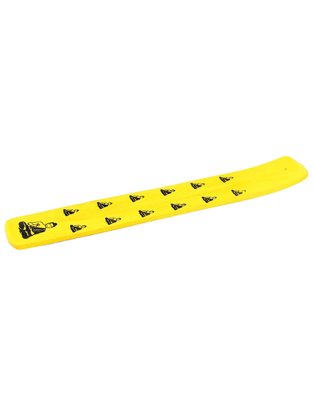 Porte encens en bois de couleur jaune décoré avec des bouddhas de couleur noir.