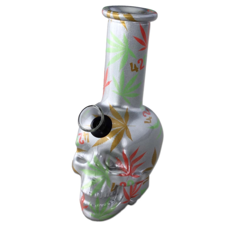 Mini bong mignon mais fonctionnel en forme de crâne. Avec un imprimé fluorescent sur toute la surface qui brille sous la lumière ultraviolette (lumière noire).