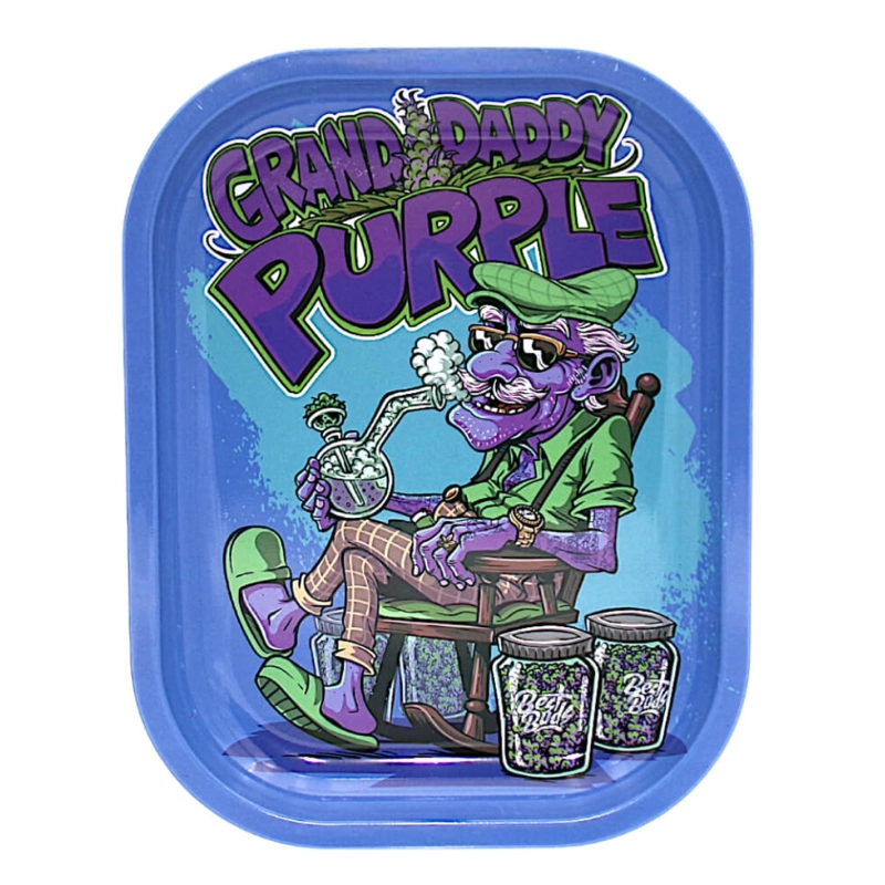 Plateau à mix en métal ayant les dimensions 18 x 14cm avec une image qui représente un grand père en train de fumer un bong de weed purple.