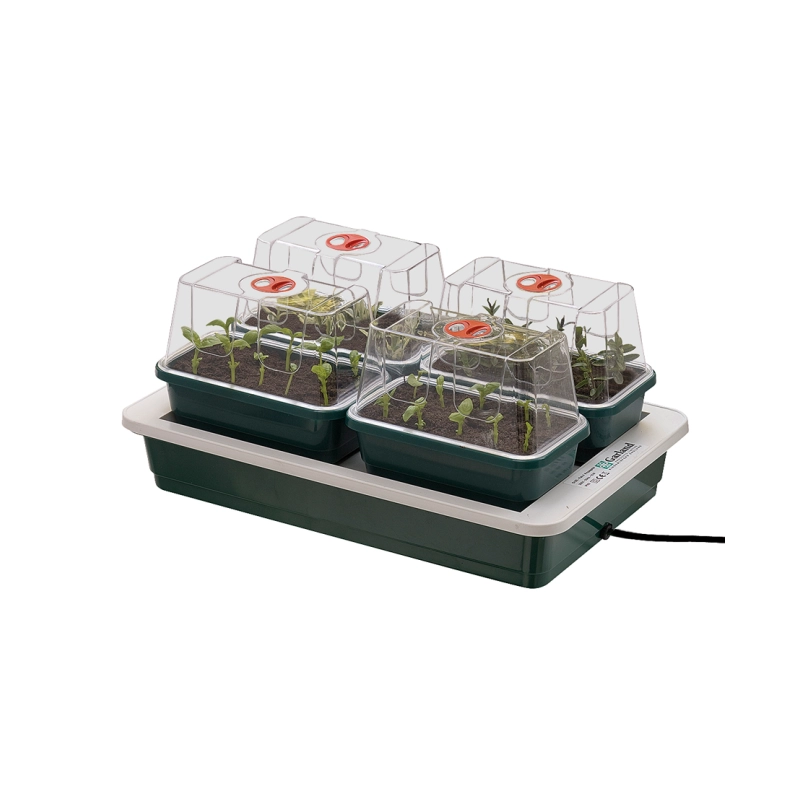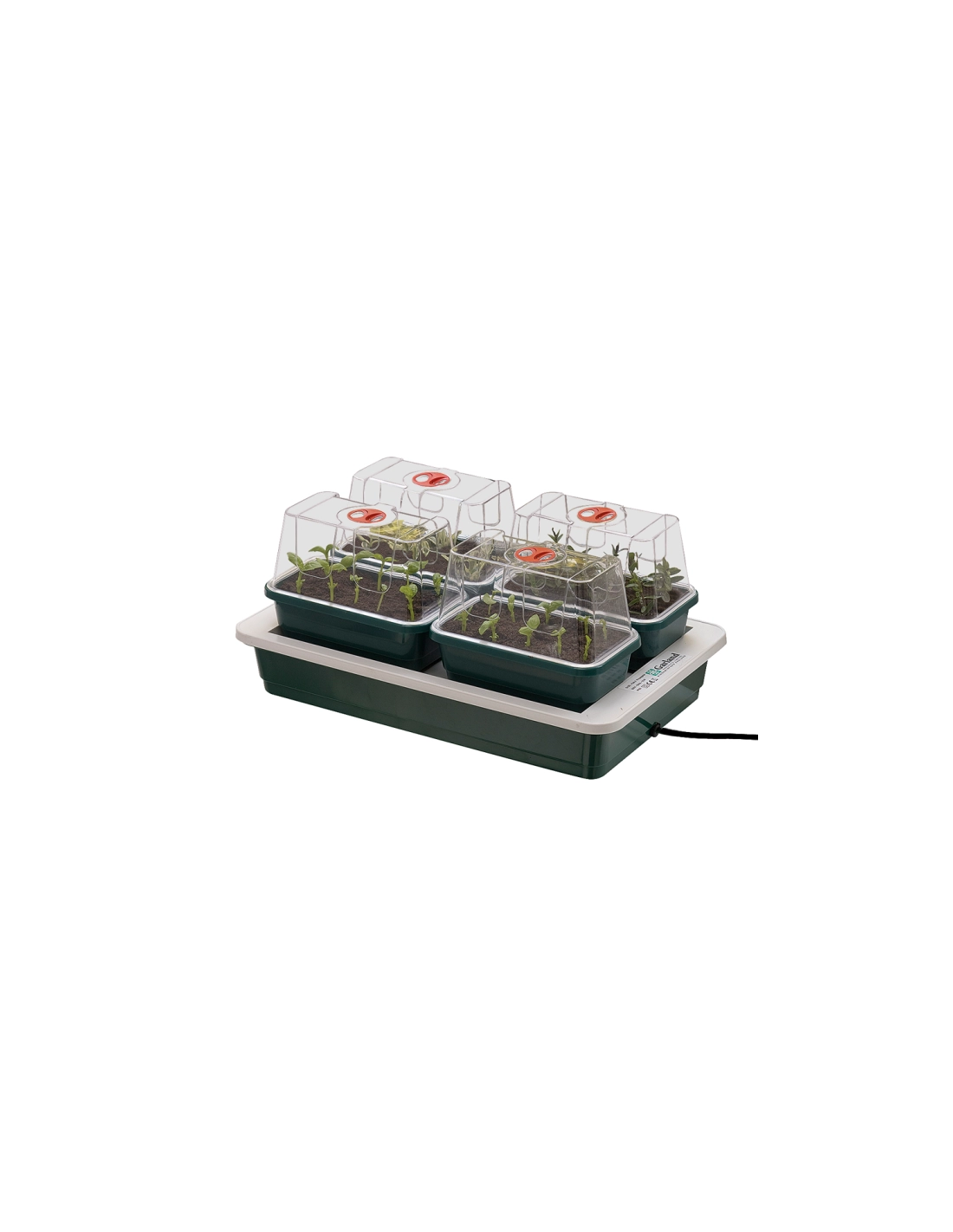 4 mini-serres, parfaites pour être placées sur un rebord de fenêtre. Pour les jardiniers qui souhaitent cultiver une série de variétés de semences. Cette unité n'est pas contrôlée par un thermostat et a été conçue pour augmenter la température ambiante du compost d'environ 8 °C. Elle peut donc être utilisée comme serre.