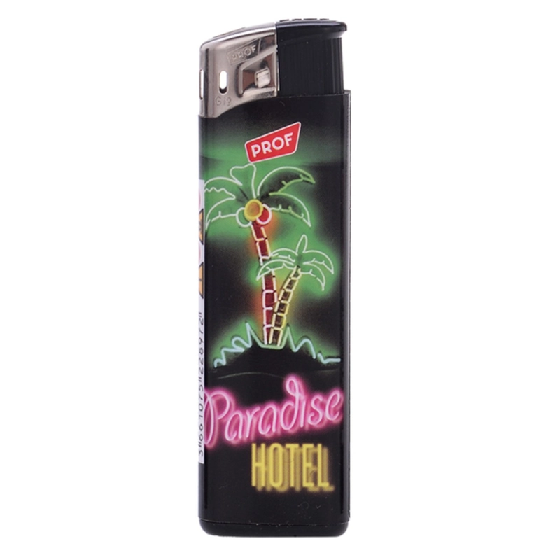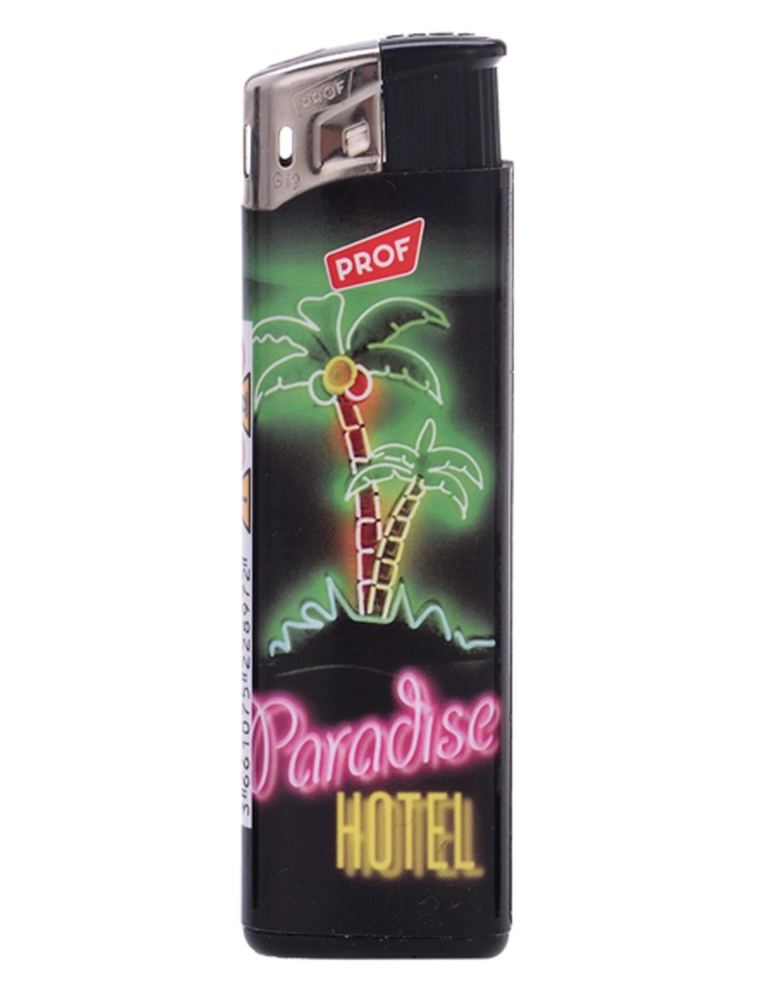 Briquet Électronique de la marque Prof représentant l'enseigne du Paradise Hotel en néon. Lorsque votre briquet sera vide, vous pourrez à tous moment le recharger avec du gaz à briquet.