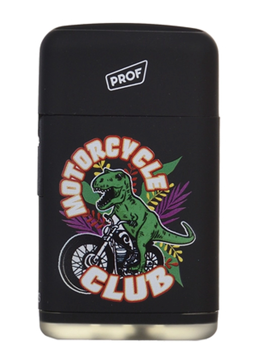 Briquet torche dans une capsule en plastique avec un dinosaure faisant de la moto avec l'inscription Motor Cycle Club. Ce briquet peut à tous moment être recharger avec du gaz à briquet.