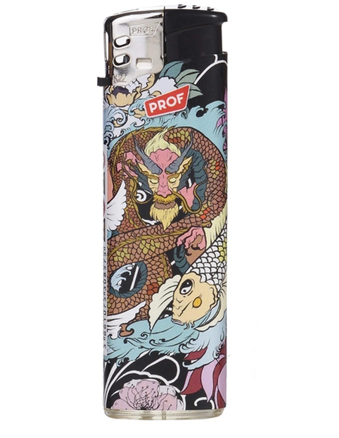 Briquet électronique de la marque Prof non rechargeable et décoré avec un dragon chinois jaune.