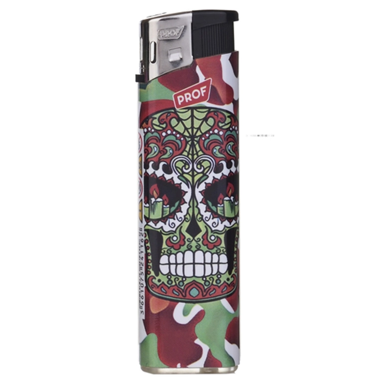 Briquet électronique non rechargeable de la marque Prof décoré d'un crâne mexicain avec des bougies dans les yeux.