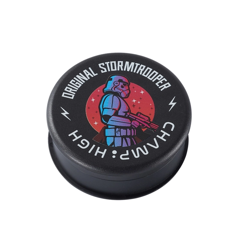 Grinder plastique Champ High en 3 parties noir d'un diamètre de 60mm qui est décoré à l'effigie du film Star Wars avec un Stormtrooper sur un fond coloré rouge