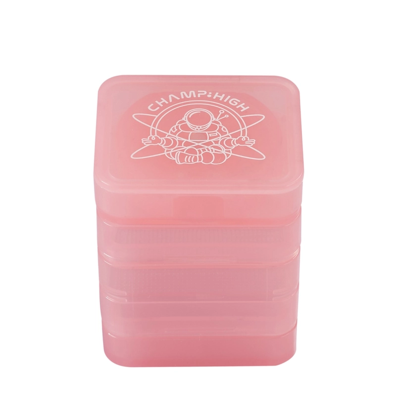 Grinder en plastique rose Champ High de forme carrée munis de 4 parties dont 1 pour récolter le pollen de vos herbes préférées. Ce grinder est carré fait 49mm de côté et 40mm de hauteur, son diamètre intérieur est quant à lui de 40mm.